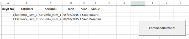 Arkasindan katilimci, sorumlu, tarih, sure, sonuc degiskenlerimizin sonuc formunda hangi hucrelere aktarilacagini adresliyoruz: