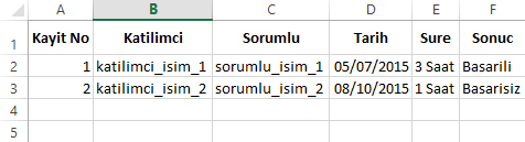 Arkasindan katilimci, sorumlu, tarih, sure, sonuc degiskenlerimizin sonuc formunda hangi hucrelere aktarilacagini adresliyoruz:
