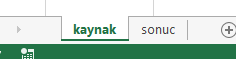 Ve son olarak, bir karisiklik olmasin diye Sheet 1 ve Sheet 2 ‘de yer alan kaynak ve sonuc sekmelerimin isimlerini kaynak ve sonuc olarak degistiriyorum.